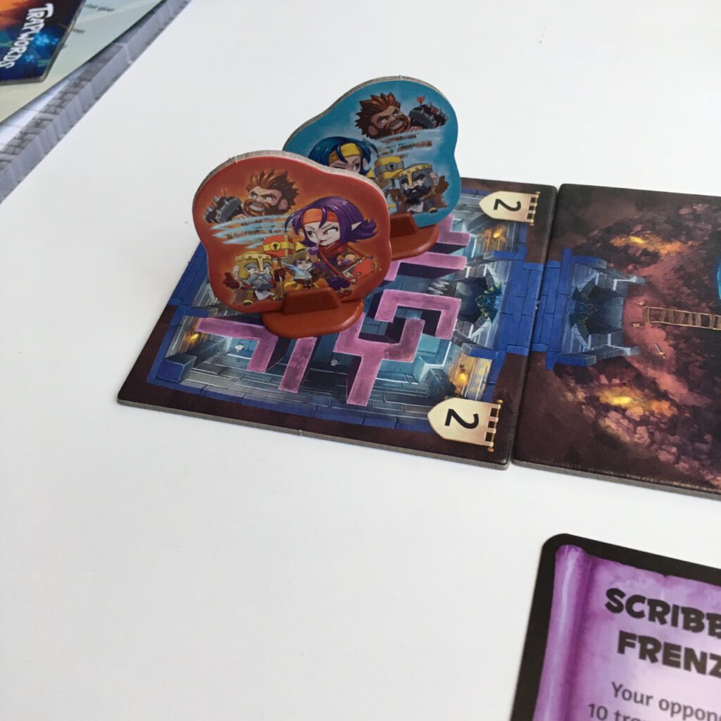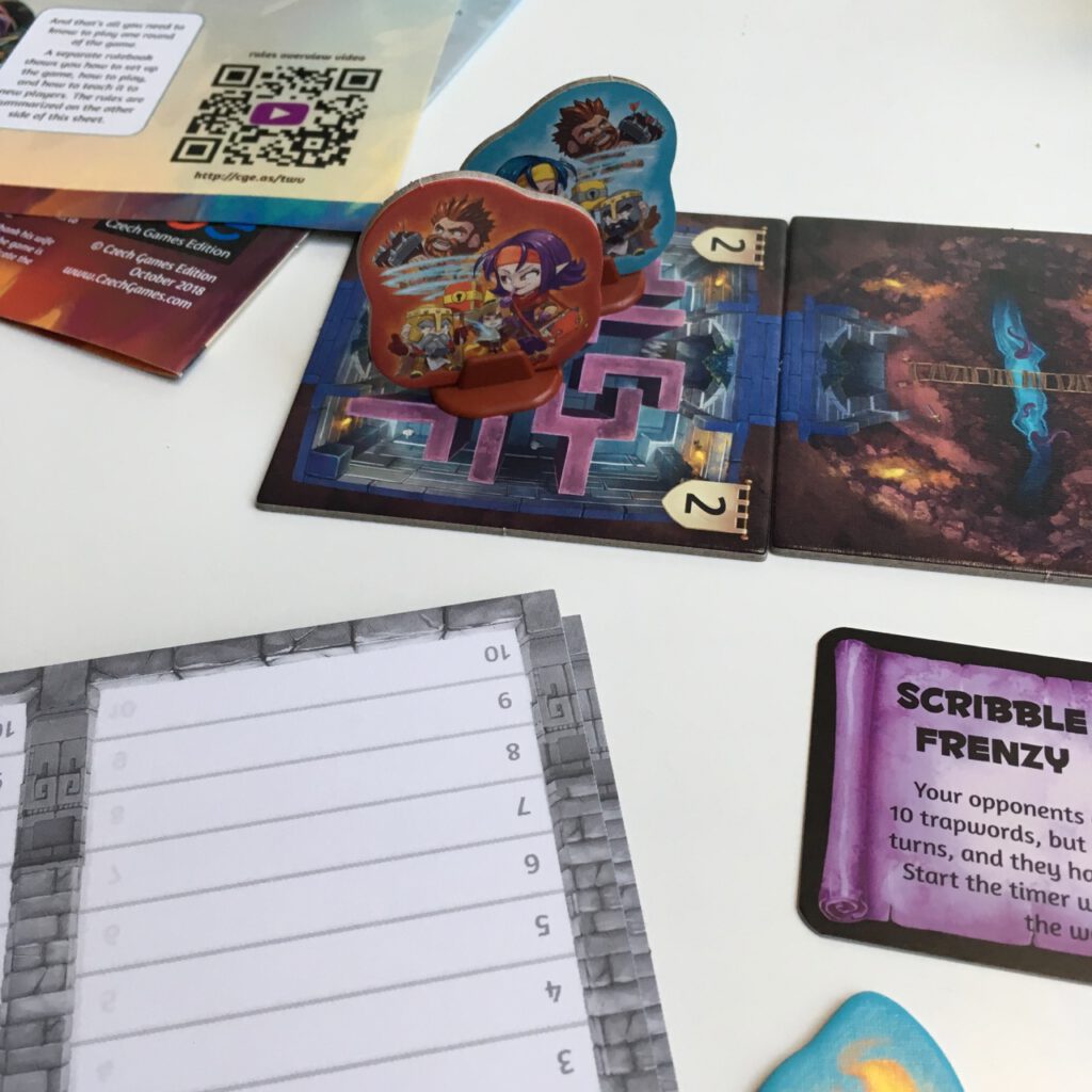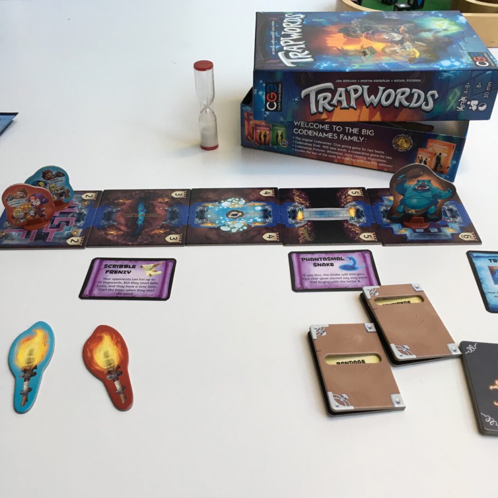 In each round, a word for each team is secretly chosen, and one person on each team will be the clue-giver. Both teams now get to look at their opponents’ word, and then secretly write down some ‘trapwords’. These are words the clue-giver may not use; but the cluer doesn’t know what they are. The timer is flipped, and one team begins, whilst the other team listen out for the trapwords. the clue-giver can usually give as many clues as they want, though the rest of the team can only take five guesses at the word. If they correctly guess, they win, and progress to the next room – if they run out of time, or guesses, or a trapword is uttered, they lose. If neither team is successful, meaning no-one moves nearer to the boss monster, the monster moves a room closer, ensuring that the game never exceeds 8 rounds in total.