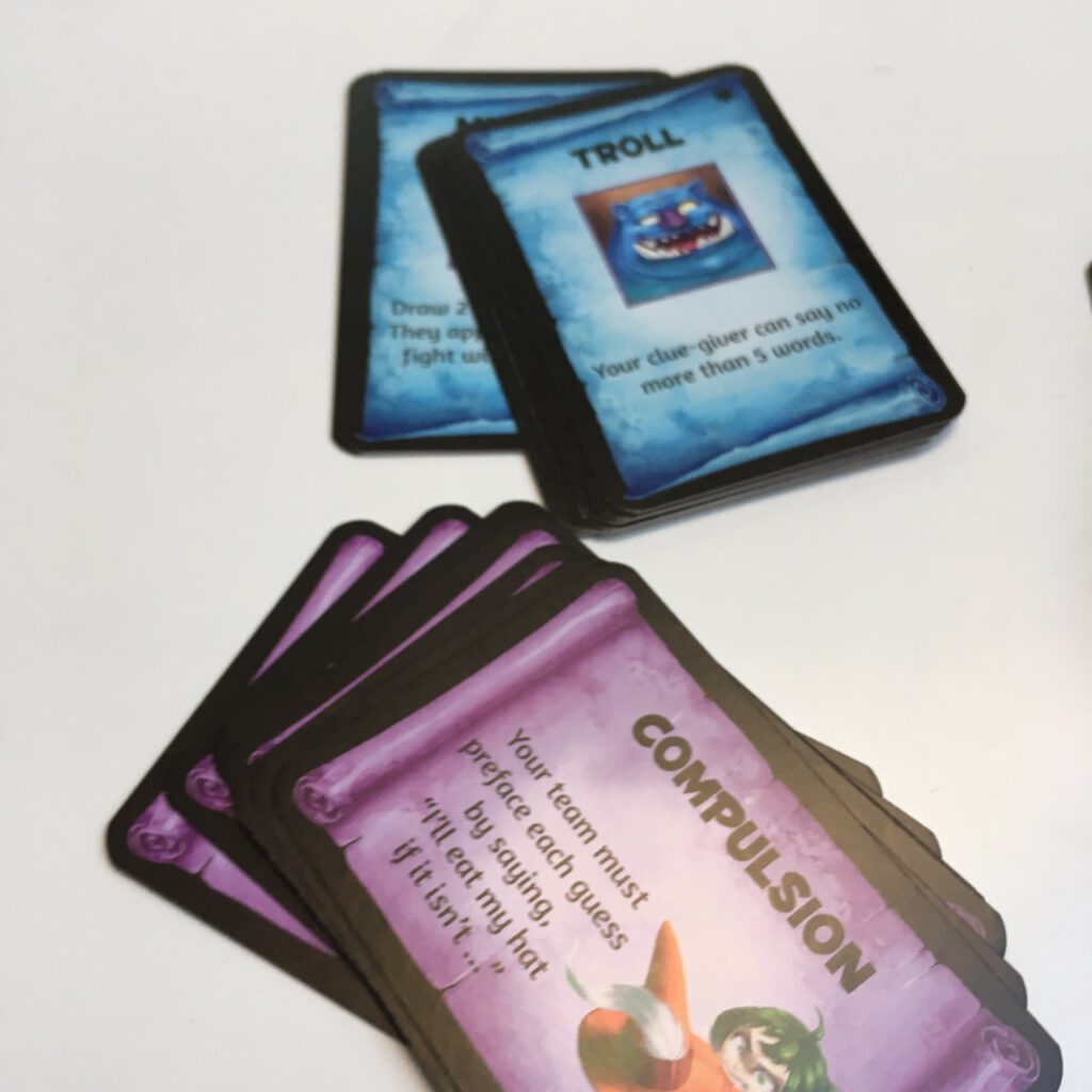 The rooms have some special effects of their own – they allow progressively more trapwords to be picked by your opponents, and some are ‘cursed’, meaning they impose an extra restriction on the players. The curse might be ‘Petrification’ – as soon as your team have made their first guess, the clue-giver may not speak; or Feeblemind, forcing the cluer to user only nouns. The boss monster fight at the end will simply be another word guessing round, but each monster has a further restriction – for instance only three guesses, or cluing with a restricted number of words.
