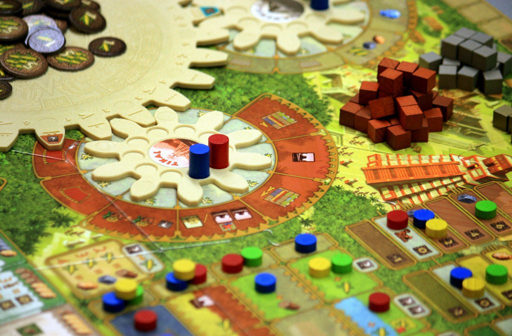 Tzolk’in combines a beautiful and mechanically impressive board – one that contains the moving parts of the Mayan calendar, that move at the end of each turn. The various cogs – or gears, as the game refers to them – interact with each other, and with the player’s pieces.