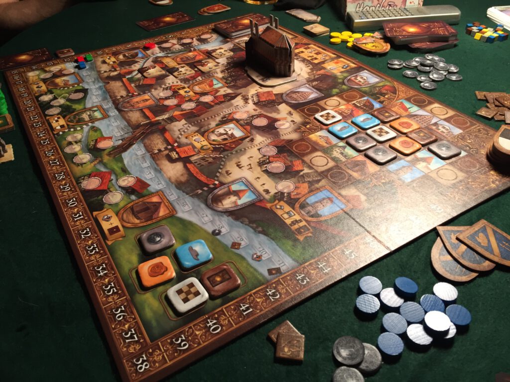 The board is placed centrally showing the city of Ulm, and there are two elements of it that form the crux of the game. One is the River Danube: your boats start at the western end, and progress eastwards during the game. This not only represents points (the further east you are, the more points you get at game end) but also what city quarters you can influence as you travel.