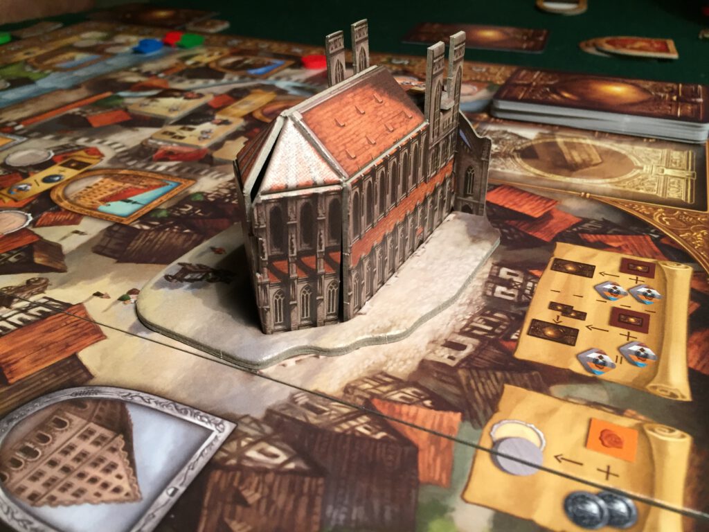 Ulm‘s church is the tallest in the world, and it forms the centrepiece of the game, where you the players are trying to assert the most political and cultural influence on the city, represented in the form of victory points.
