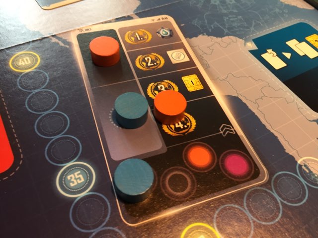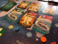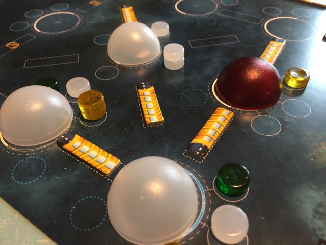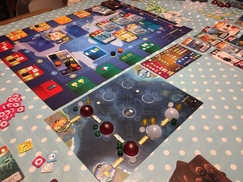 There’s a fair bit of iconography to get your head around owing to the gaming industry’s love of (or reliance on) language-independent components. And there are one or two wrinkles we’ve not covered here, such as symbiotic cities (-which score points) and how turn order (-vital) is decided. But unlike many games of this weight, the story doesn’t disappear into abstraction when you start playing, and although it’s not lavishly produced everything you construct has a pleasing tactile aspect to it: you are literally building the cities, tunnels and bases by adding them to your board. That really helps with both comprehension and the experience. It is long though: with four players especially you may need a pot of coffee/several brews to see you through the whole ten rounds – in fact it’s probably best experienced with two or three. But for those who like the non-combative nature of the play, the theme, and the canny strategizing opportunities, this is worth persisting with. The action/card matches throw up both moments of agonised frustration and delight when it all comes together and you pull off a move that catapults you into the lead…