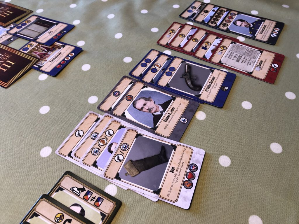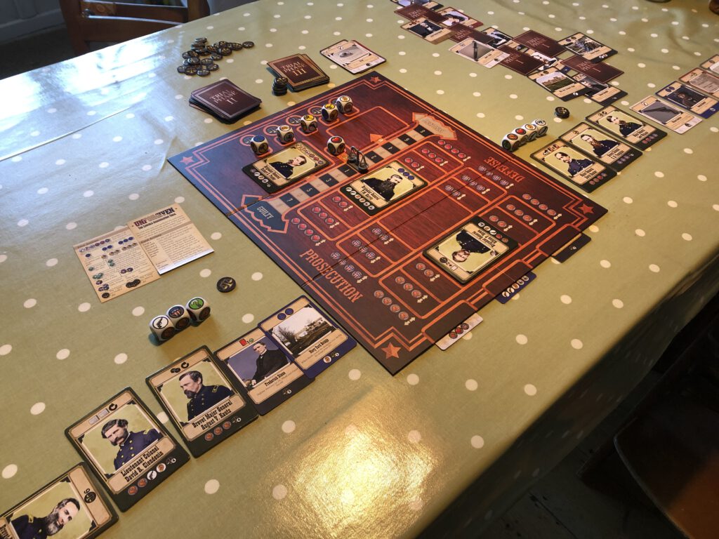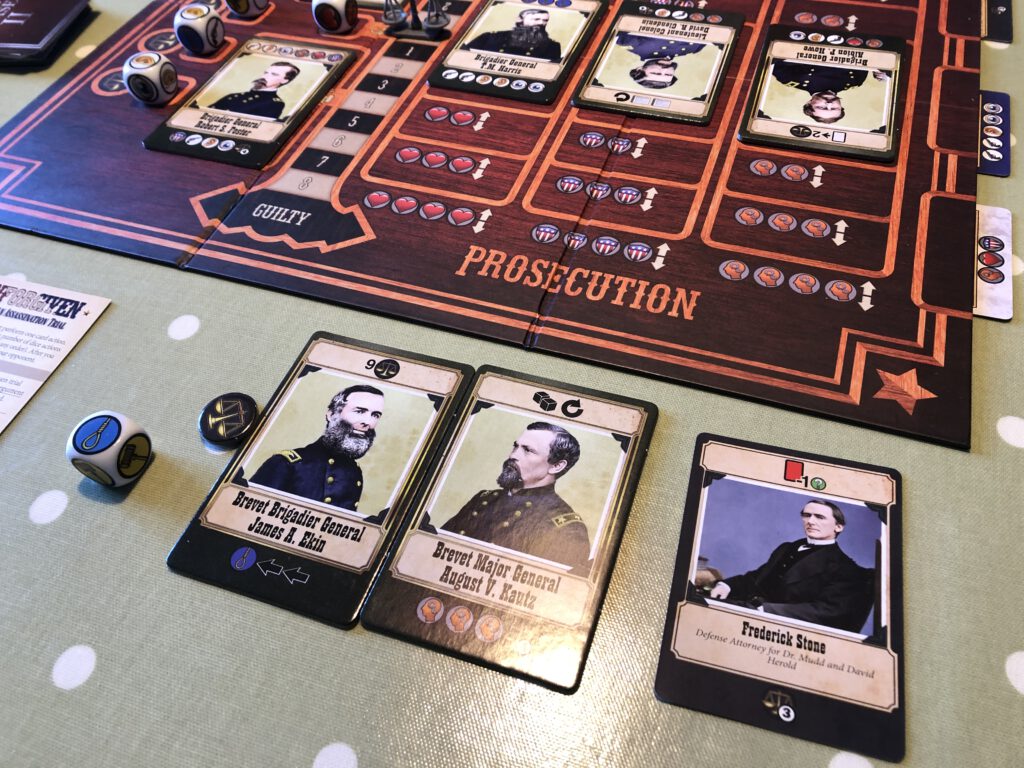 A lot of two-player games have this tug-of-war feel to them, with players fighting for control, or majority, or a shared objective. Unforgiven has deviously devised things so pushing for one of them can critically waylay the others, and this three-way battle for victory imbues every decision you make – particularly in the latter stages of the game – with weighty consequences. Pushing for a justice victory, for instance, can be risky, as you give free reign to your opponent in swaying the jury. But focusing your all on the jury is expensive: you need to build a powerful argument to sway the four jurors you need. Plotting for the full-length trial victory might be safest – but you mustn’t hand your opponents the freedom to do whatever they want with the cards you’re neglecting. Thematically-speaking the Mary Surratt angle may disappear as you play (- it could be any trial) but mechanically designer Tom Butler has come up with something of a treat.