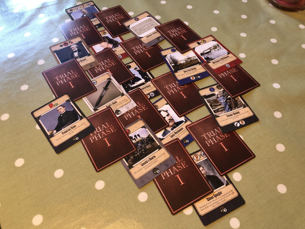 Both sides begin with two sympathetic (but not yet convinced) jurors. Five more sit undecided on the board itself. Then Trial cards are laid out in a pattern (see pics above) that players will select from one at a time; each card taken making any cards below it potentially available. The three phases of the trial are the taking-of-cards – when all cards are gone, a new phase begins.