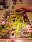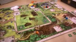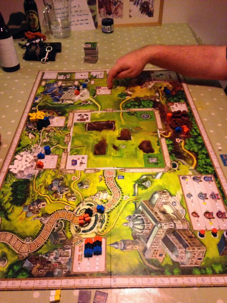 The various stopping places generate the supplies you need to build: wood, marble, gold. There are also places to pick up decorations (which must be paid for), add more workers to your crew, and (importantly, in terms of maximising your potential moves on the board) moving up a series of progress tracks, which allow you to make moves on other players turns! Finally you can – you must! – also collect and pay for tiles, which represent the different parts of the palace. You then make a trip to the site to ‘build’ the tile, and score the appropriate points for it.