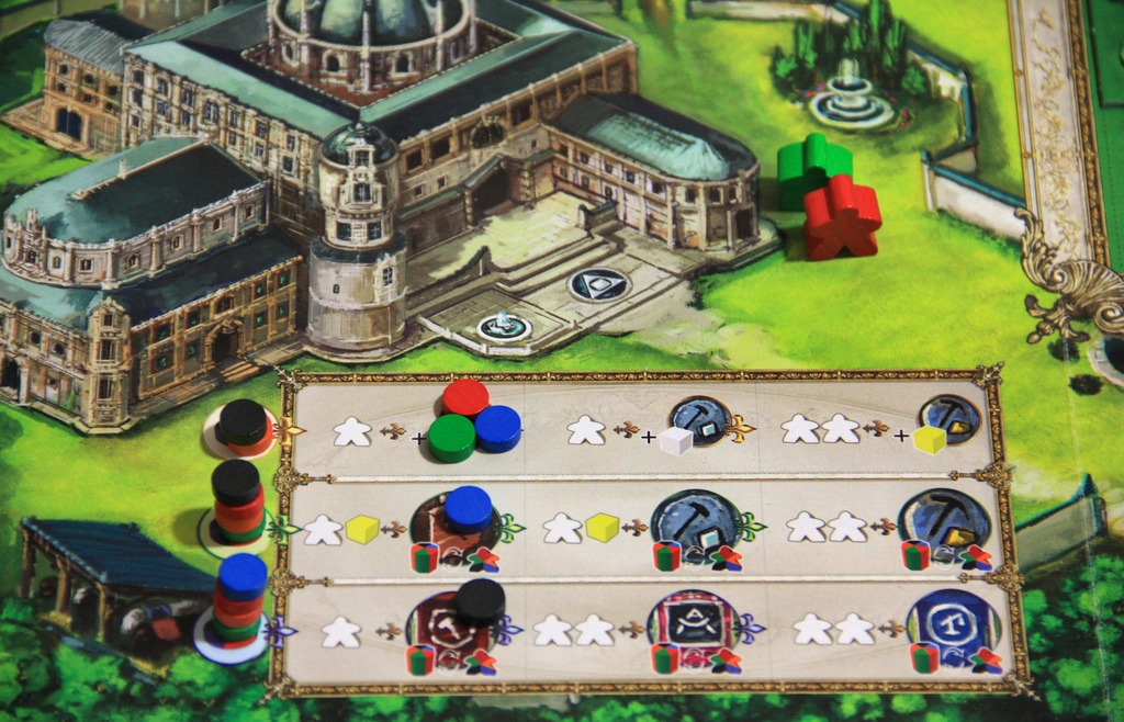 The board shows the site Versailles is to be built on in the centre, with various locations around the outside of it. On the board will be your workers, and on your turn you move them around the building site in a clockwise direction, occasionally moving into the centre to construct part of the palace.