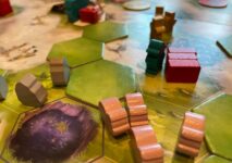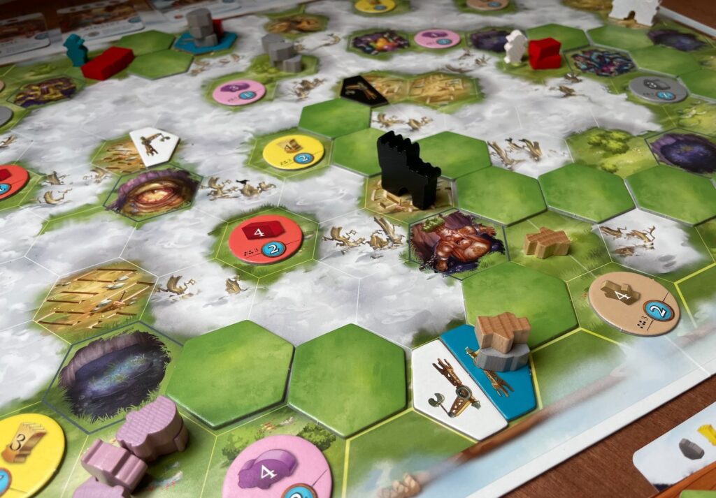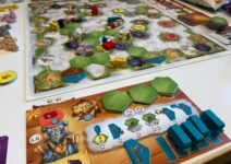 Once you’ve taken a few turns, the rules become clear. But the tricksiness of the game is how anyone can access each other’s resources, and everyone uses the same delivery network of open spaces. Not only that, each ruins hex has room for two building sites, so players can end up sharing the same hex. Workers are also a precious resource, because they do not return to you until all the resources they’ve found have been delivered somewhere. So it’s a sort of bunfight crossed with a race. When anyone places their fifth and final building, every other player gets one last turn, and then points are scored across four categories – and lost on a fifth one. But rather than get into the weeds of the scoring, we’ll wrap up the overview here.