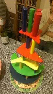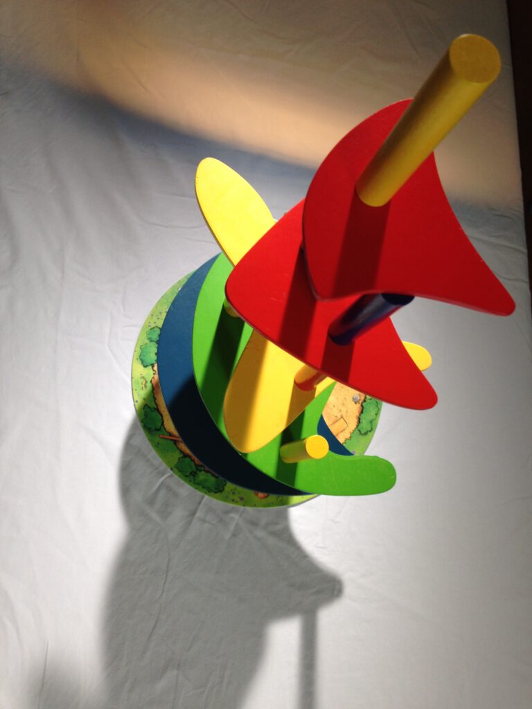 The game consists of several wooden ‘towers’ in three point values (1,2 and 3), a set of floors to build them on, and a metal hook for removing them from the floors below. At the start of the game all the towers are laid out randomly on circular cardboard base, making sure they are reasonably mixed up (i.e. don’t have all towers of one colour around the edge or clustered in the middle). Then each player rolls the Master Builder Seal to decide what colour towers they’ll play. The last player takes the last available colour and begins the game by placing the next floor on top of the towers.