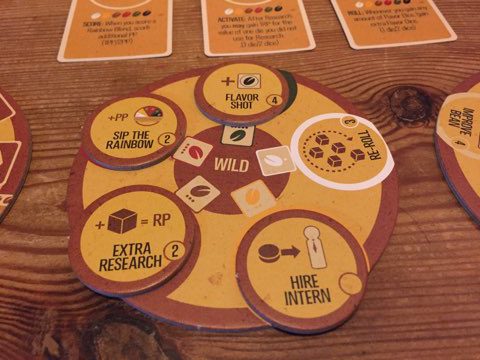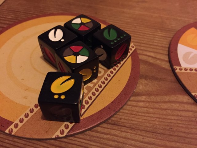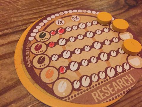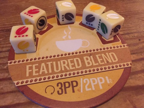 The game is primarily dice and some coasters that represent coffee blends. Everyone has a sheet to keep track of their performance points and research points (RP). On your turn you roll the coffee bean dice and decide how to allocate them. You can choose to make a Featured Blend coffee, as long as your blend is stronger than whoever (if anyone) currently has the featured blend: there is a hierarchy to the dice similar to poker, so four of a matching bean will beat three, and three will beat two and so on. Place your dice on the featured blend coaster and score a point. If you’re lucky enough to roll five different beans, you can claim the Rainbow Blend – this also scores a point, and has the added benefit if not occupying your dice. When your turn comes around again, if you still have either blend in front of you (i.e. they’ve not been claimed by anyone else) you keep scoring points for them. If your dice are on the featured blend, you can remove them and re-roll them, or keep the featured blend (and not roll) in the hope you’ll score again for it on your next turn. Featured blends, however, degrade over time, so if you want to keep it you have to remove a die from the coaster.