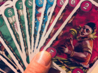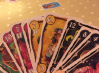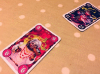 The deck is made up of five suits of cards numbered from 0-12. Players are dealt a hand of cards and five rounds are played. In each round, as soon as any player takes their third trick, they are out of that round – and their score is the number of tricks all the other players have taken at that point. The exception is the last player standing will only score their own tricks – so really the key here is to ideally be out second-last, but definitely don’t be last!
