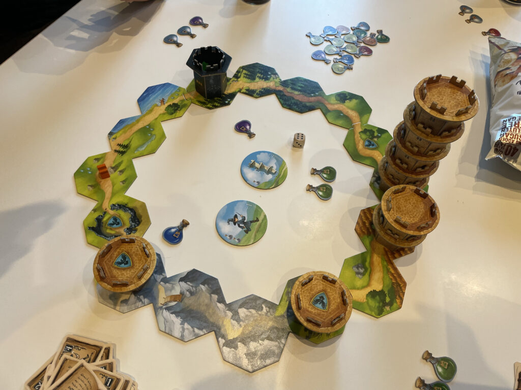 Full potions can be spent on a spell: once per turn only, you can cast a spell to move a wizard or a tower, but be careful: most (full) potions is the tie-breaker when the game ends. As soon as one player gets all their wizards into the tower, that triggers the final round.