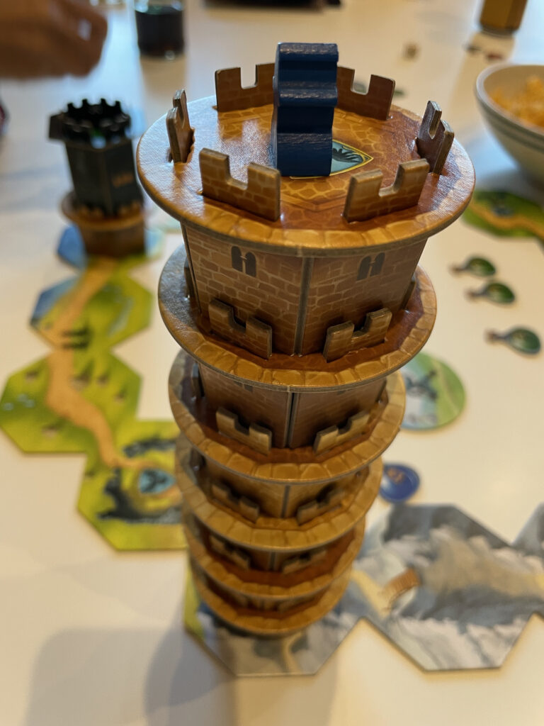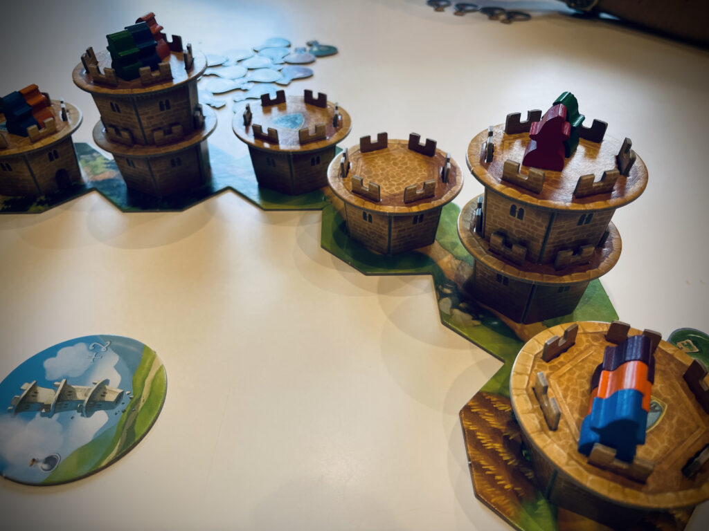 Wandering Towers is a racing game of sorts, where the players are trying to get their wizards from the standard towers (see pictures) around the track and into the raven tower. The problem is, the towers keep moving…