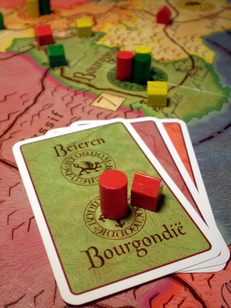 The board shows a map of Europe with cities linked by roads and sea routes, and the countries are divided up into different colours – each colour representing two different countries. On your turn you’ll be using cards to place either Monasteries or Advisors in the countries – Monasteries will score you points for having a majority in a given country (you also get (fewer) points for placing second or third) and also score as chains, linking cities together either in one country or across two or more.