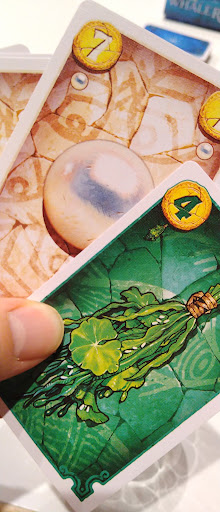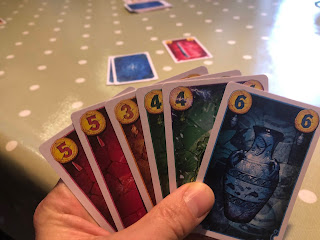 Everyone is dealt a hand of cards, which are numbered from 3 to 7. Turns are simple: you play a card to the table in front of you, face up, and draw a replacement from the deck. As soon as all players have collectively played a number of cards that matches the number on them (three 3s, four 4s and so on) two things occur: anyone who played that number flips their cards over – they’ll score their numeric value at the end of the game. The other – less productive! – thing that happens is all other face-up cards are discarded, meaning players who might be on the verge of a big set (eg seven 7s) are now back to square one. So there’s an element of risk to things: the 3 cards are easier to complete, but score less. The sixes are sevens are harder to come by, but will score a lot more points.