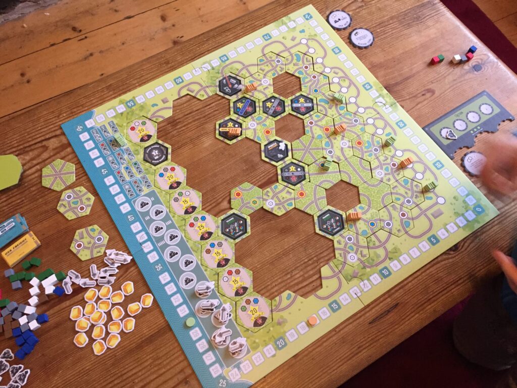 Each turn players collect coal from supply and take up to four actions using coal or whistles (or both) to move their trains along the track. If they move their train along a track off the existing map, then they add a hex from their hand to extend it, meaning as the game progresses the board slowly fills up. Coal can take you one space only – and never east! – whereas the whistles can take you up to two spaces in any direction. Wherever your train stops at a minor stop, you pick up the goods shown there (one of several coloured cubes). When your train stops at a major stop (the black special tiles) you can use that stop to improve your position in the game (picking up coal, whistles, or gold for points) or, if the major stop is a city, you must pay the goods that city wants in order to collect the points, and a share in the railroad company shown on the city tile ( – if you stop at a city without the goods, it costs you points instead). The most rewarding cities, though, are nestled along the west coast, and delivering here not only gets you big points, but also a reward of goods/coal/whistles/gold.