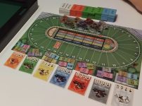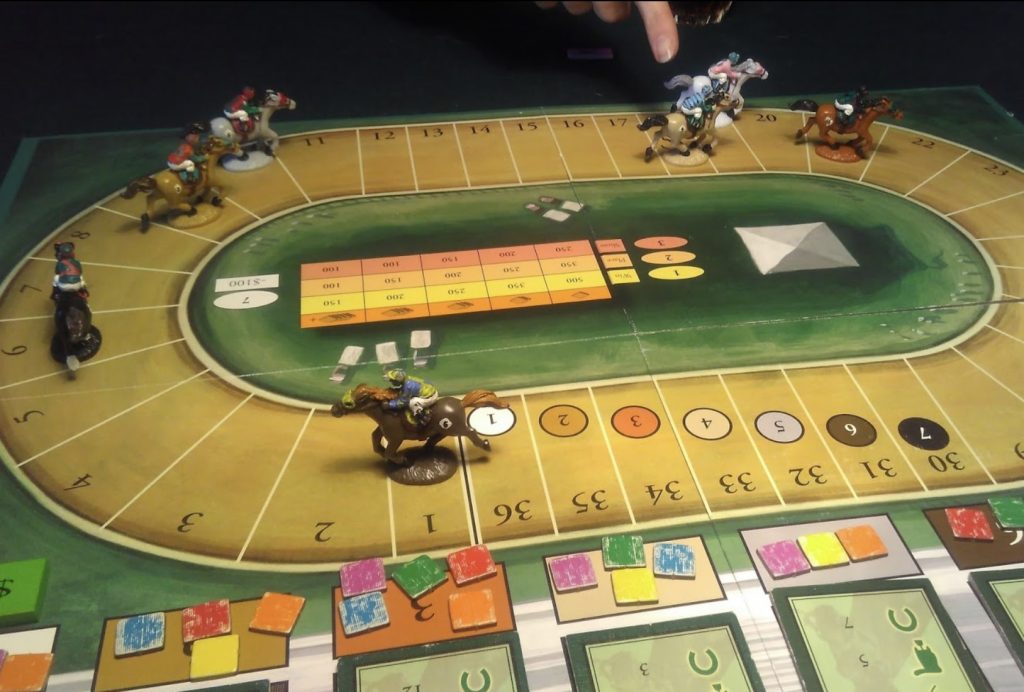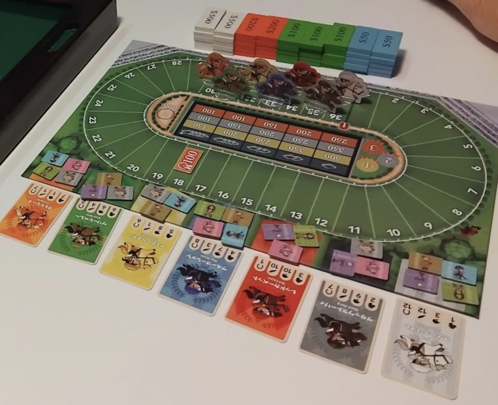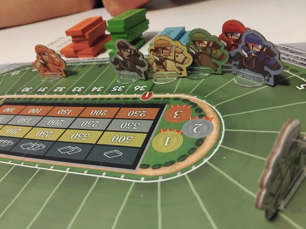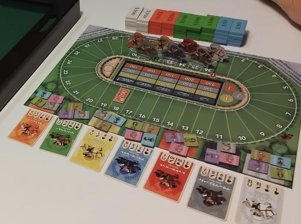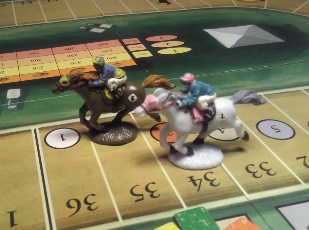 With the third and final race, winnings are doubled, and then players count up their cash: whomever has the most money is the winner. The game can optionally be played with all betting chips face-down, giving each race a little extra drama to the reveal at the end, and with horses sharing spaces on the track or not (instead, any moving horses ignore occupied spaces).