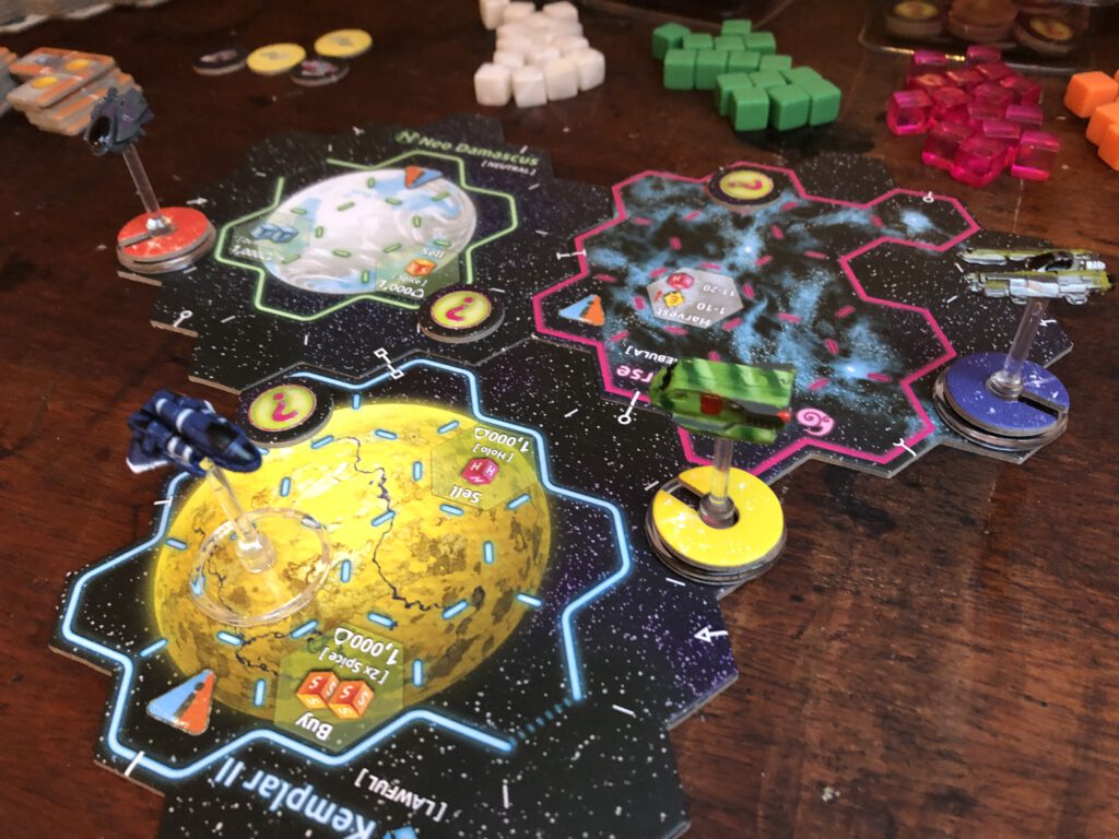 And so players circle the planets, hazards, and each other, completing missions and trade, sometimes blowing each other up, sometimes being slightly less psychotic, and basically trying to be the biggest baddass around. If you’re unsure about what really is a space opera, grand in every way, then as noted above, you can simply agree to play for two hours and whoever leads at that point (make sure you all have the same amount of turns!) is the winner. Or you can just play all day. And all night. And keep going forever.