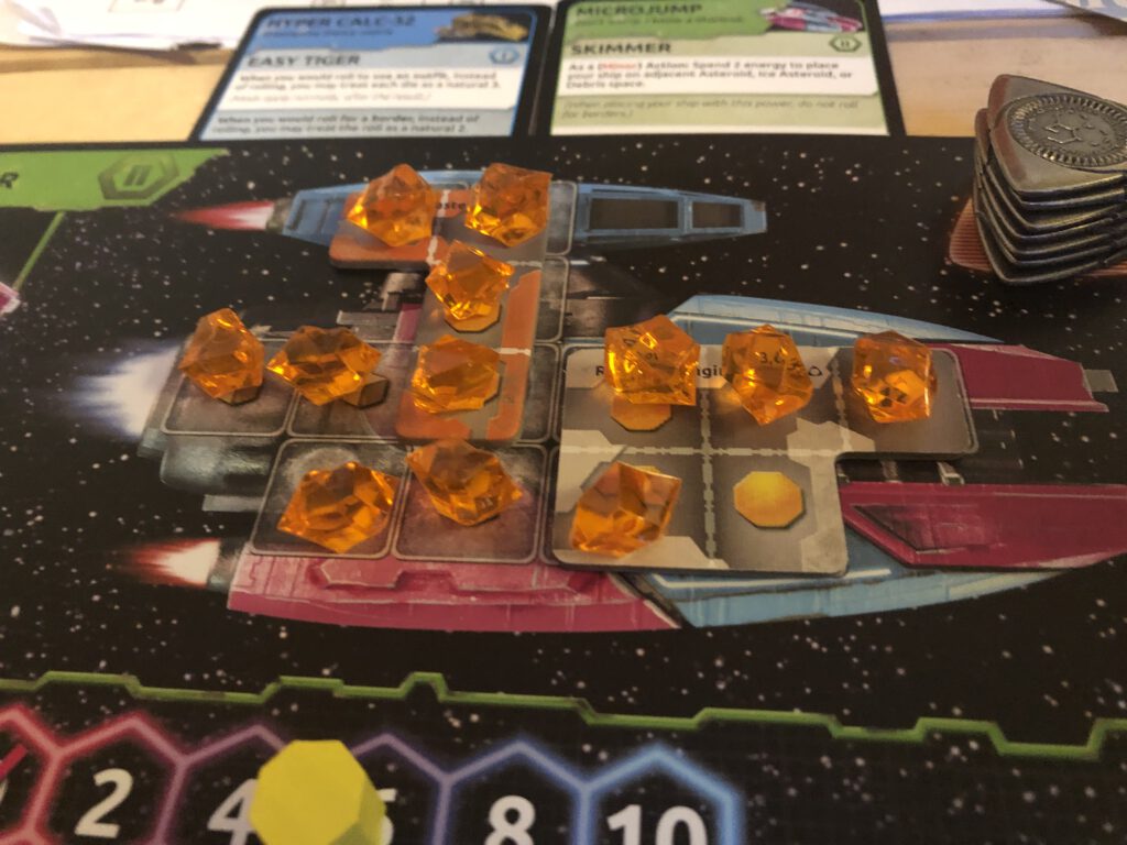 When you’re out of actions, you can spend Energy (also tracked on your ship) to re-arm them. The catch is of course that this means you’re always running out of energy, and can only recharge your energy by ending on a planet – which might not be where you want to be… if you’re out of markers and out of energy, that’s not a good place to be. You always have some minimal movement (called impulse) but you’re otherwise considered stranded. Players can fly alongside you and donate energy – helpful for you, but them too, as they’ll get fame for their benevolence…