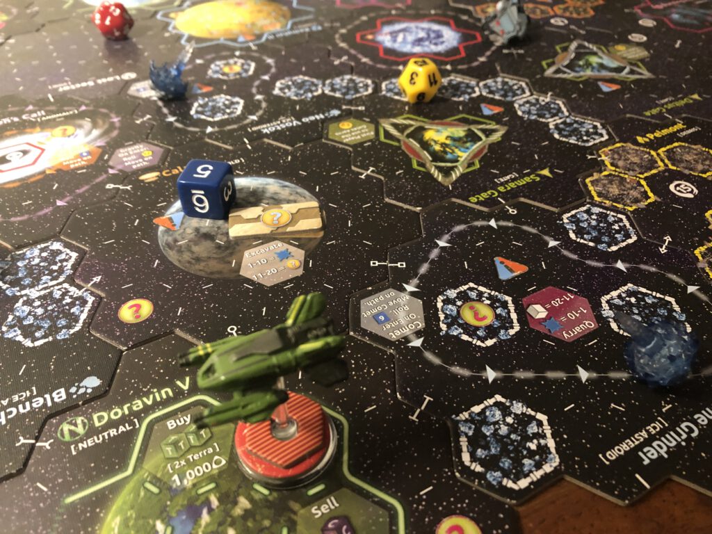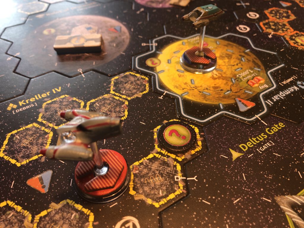Assuming you’re not dead, Xia’s various hexes contain more than just planets and hazards: there are gates which allow quantum leaps around the board, and the various borders to certain locations mean that danger is always lurking as you attempt to cross them.