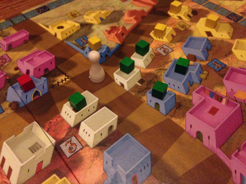 The camel trail, like the city, is scored at the end of each week (or before, if it is full). Players multiply the amount of cubes they have on the trail by the level they have reached (there are three levels: if you have three cubes on level three, say, that’s a heft haul of nine points)