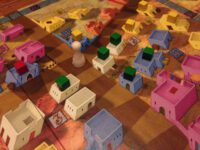Finally, the cards and buildings. Both of them help you during the game in a variety of ways. Cards are free (though you sacrifice an action to take them) whereas buildings cost camels and gold to build – but building is not an action, so you can do it as well as your standard turn. As well as helping you during play, buildings also score you points. After each week the city is emptied and scored, and at the end of the third week the player with most points wins.