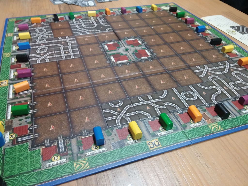 The board is a grid around which each player is assigned stations – starting positions for their track. Each player draws a tile and on your turn, you’ll be adding a tile to the board. The tiles show a jumble of track and where you put them is entirely up to you – you can lengthen your own track (which is wise) or you can deliberately target other players and interfere with their plans (which might be wise, but equally might not). As soon as a track reaches another station, it is scored depending on it’s length and whether it returned to the edge of the board or made it to a terminus in the middle (which is allegedly Paris).
